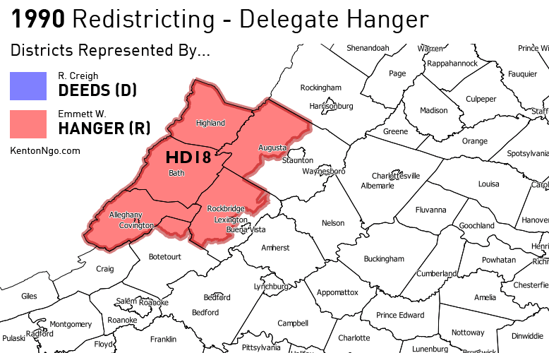 1990 Census – Democratic-controlled redistricting pushes Hanger into House District 18.